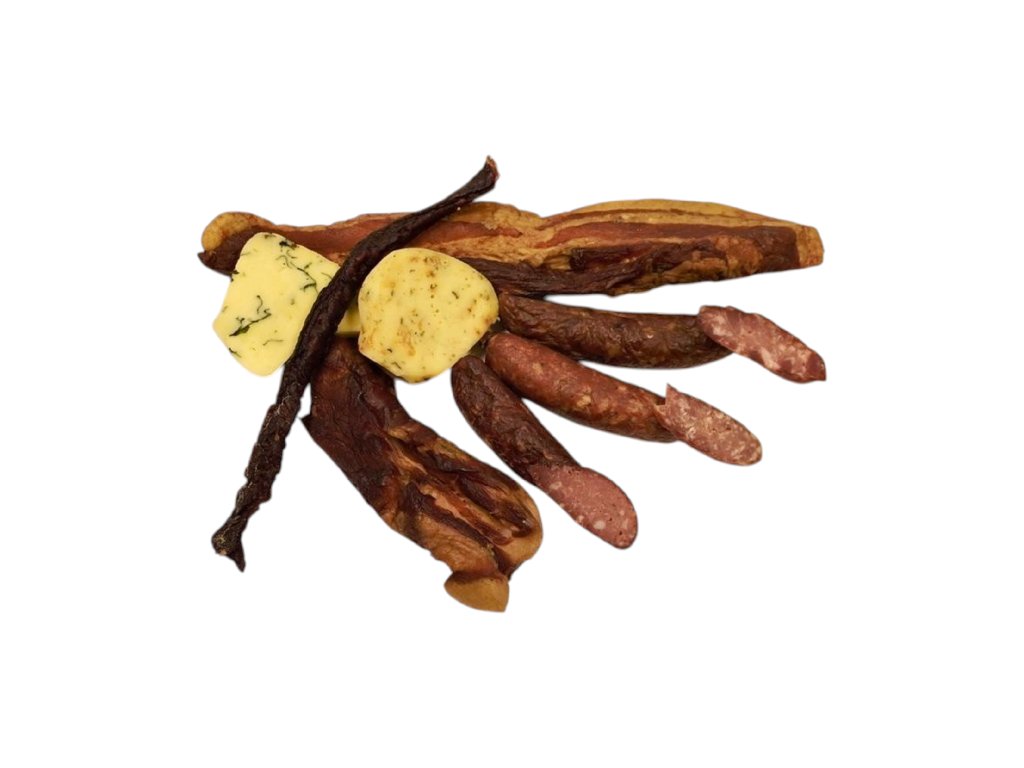 Zlatý bůček, libové uzené (kýta nebo krkovice), Královská klobása, Hovězí klobása, Libováček, Sušené hovězí maso a 2 půlky uzeného kořeněného sýra.