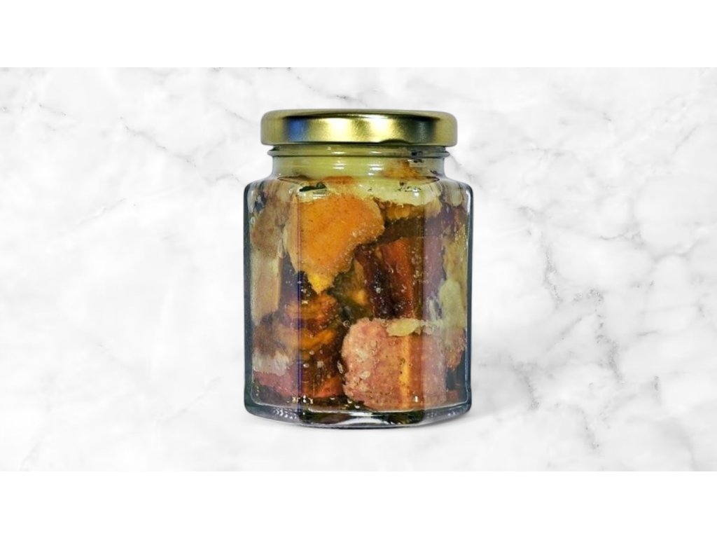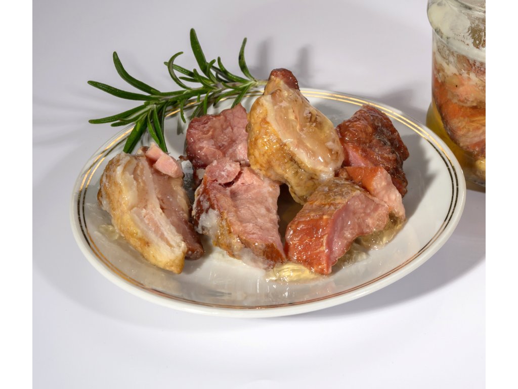 Výběr našeho uzeného masa (bůček, kýta, krkovice), které zavařením získává jemnější, gurmánský charakter. Každý kousek si zachovává typickou chuť poctivého uzení a jemně nasládlé aroma. Ideální pro rychlou svačinu, na cesty nebo k doplnění oběda – kus poctivého jídla navazující na domácí tradici a dětství našeho uzenáře